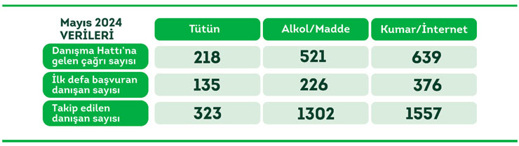 Mayıs ayında 115 YEDAM Danışma Hattı'mıza gelen 16.322 çağrı, uzmanlarımızca yanıtlandı. Danışma Hattı kurulduğu günden bu yana toplam 1.149.664 çağrı almıştır. Sabah 08.30 ile gece 00.00 arasında hizmet veren danışma hattımız bağımlı kişilere, ailelerine ve bağımlılık hakkında bilgi sahibi olmak isteyen herkese destek vermektedir.