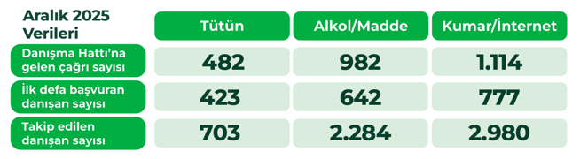 Aralık ayında 115 YEDAM Danışma Hattı'mıza gelen 16.972 çağrı, uzmanlarımız tarafından yanıtlandı. Danışma Hattı kurulduğu günden bu yana toplamda 1.540.353 çağrı sayısına ulaşmıştır. Sabah 08.30 ile gece 00.00 arasında hizmet veren danışma hattımız; bağımlı kişilere, ailelerine ve bağımlılık hakkında bilgi sahibi olmak isteyen herkese destek vermektedir.
